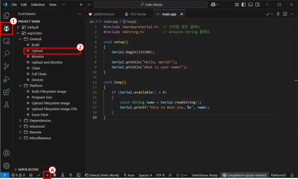 그림 2와 같이 1번 아이콘을 클릭하면 사이드바가 열리고 프로젝트와 관련된 작업들의 목록이 표시됩니다. 여기서 Default와 esp32dev는 PlatformIO 작업 환경을 의미합니다. 지금은 하나의 작업 환경만 있기 때문에 Default와 esp32dev는 동일합니다. 하지만 서로 다른 작업 환경이 설정된 경우에는 빌드하고자 하는 작업 환경을 선택해야 합니다. 상태 표시줄에서도 작업 환경을 확인할 수 있습니다. 상태 표시줄의 Default (Hello World) 아이콘이 현재 설정된 작업 환경입니다. Default (Hello World) 아이콘을 클릭하면 다른 작업 환경을 선택할 수 있습니다.
